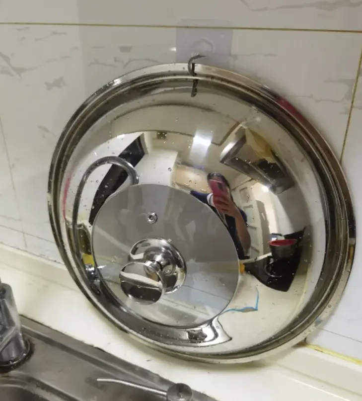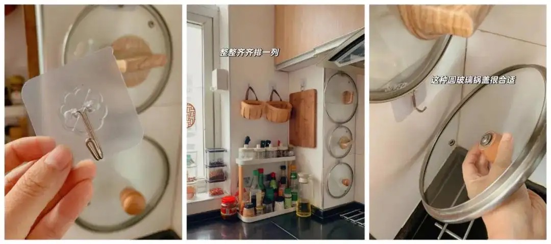 若是凹槽在外面的锅盖,可以将强力粘钩倒着安装,同样可以解决锅盖不好收纳的痛点。