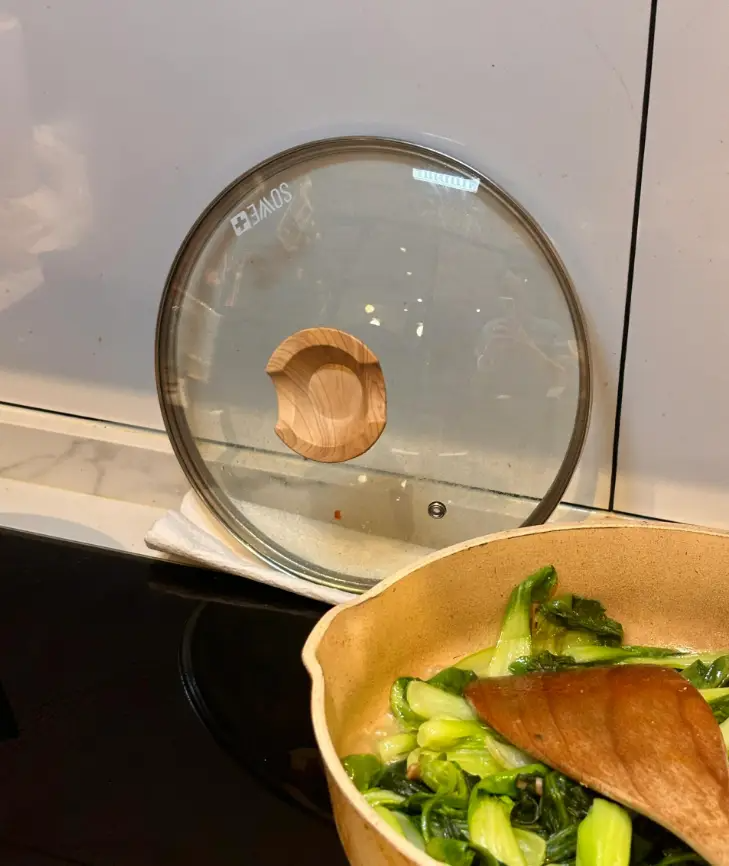 可能有的人会说,那种挂钩时间长了不会掉吗?可能会掉,但我用了一年多都没有遇到过。若不放心的话,就在台面上垫个抹布或者吸油纸,然后把锅盖放上去,就能解决锅盖放不稳的问题了。