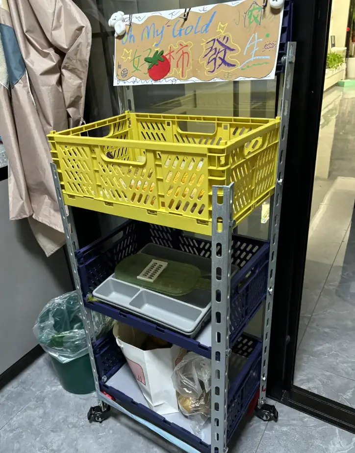 方法很简单,找几个水果筐以及四根角铁,然后用扎带将两者固定住就可以了。不管是放水果还是蔬菜,都非常好用。