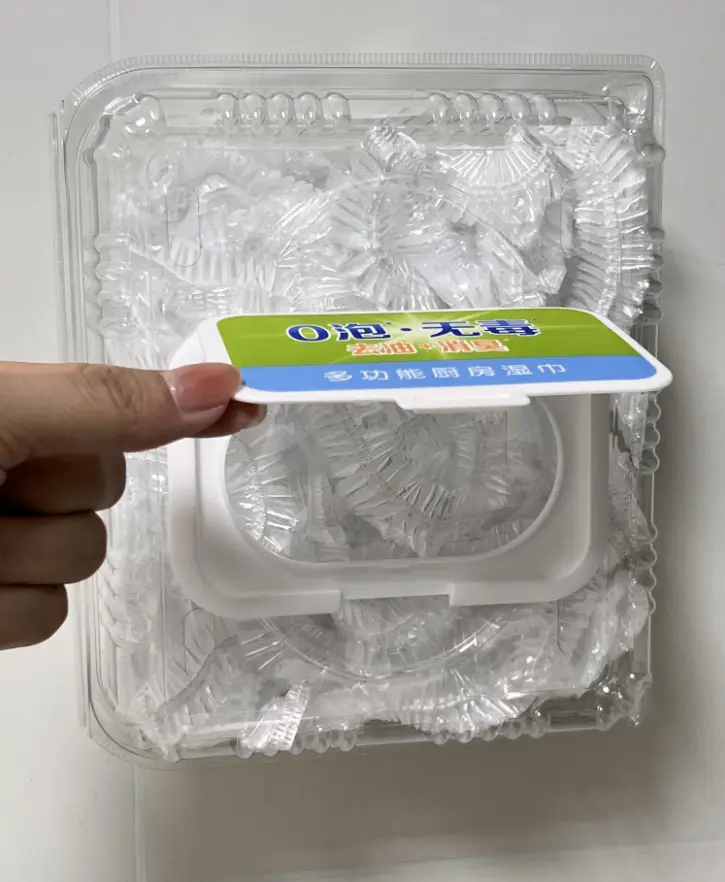 2)你还可以在水果盒上开个洞,然后把湿巾盖粘上去,同样解决了保鲜膜套不好收纳的痛点。