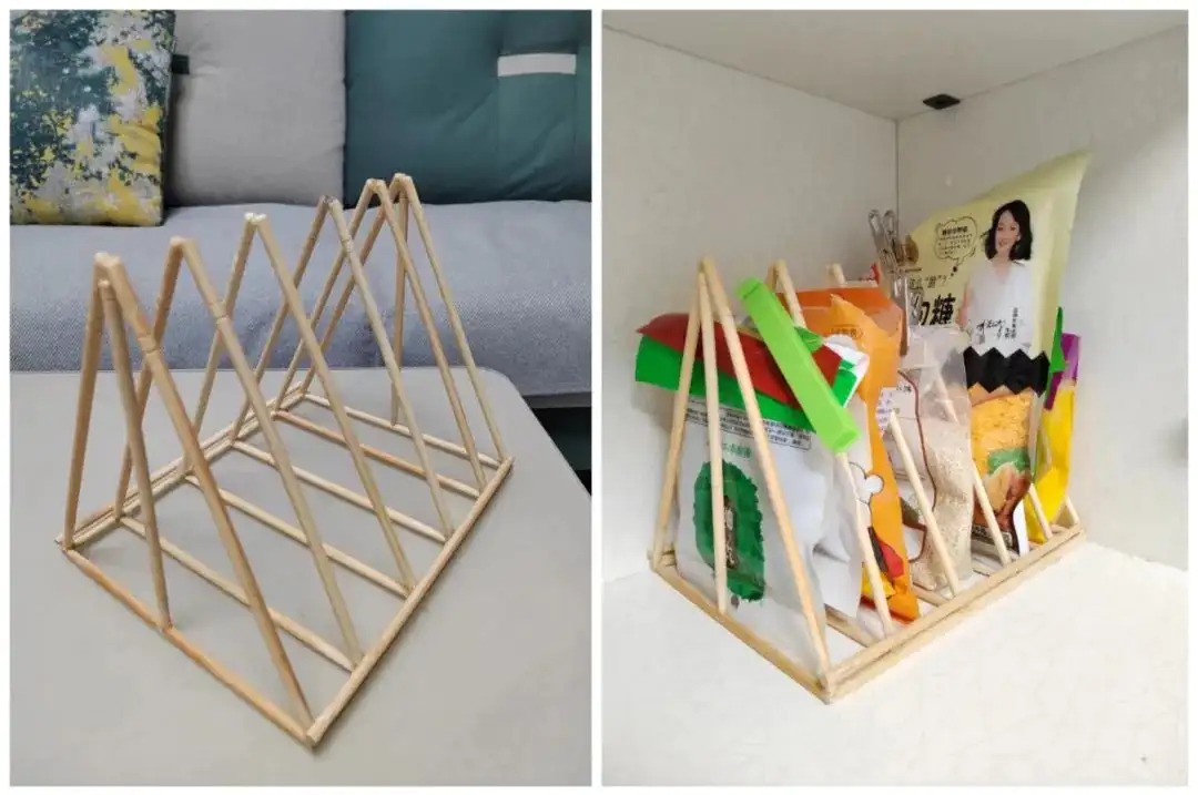 2)如果想放柜内收纳,可以用一次性筷子+热熔胶拼一个收纳架,这样就不会东倒西歪了,简单又实用。