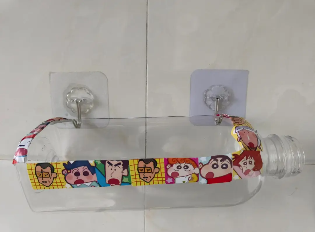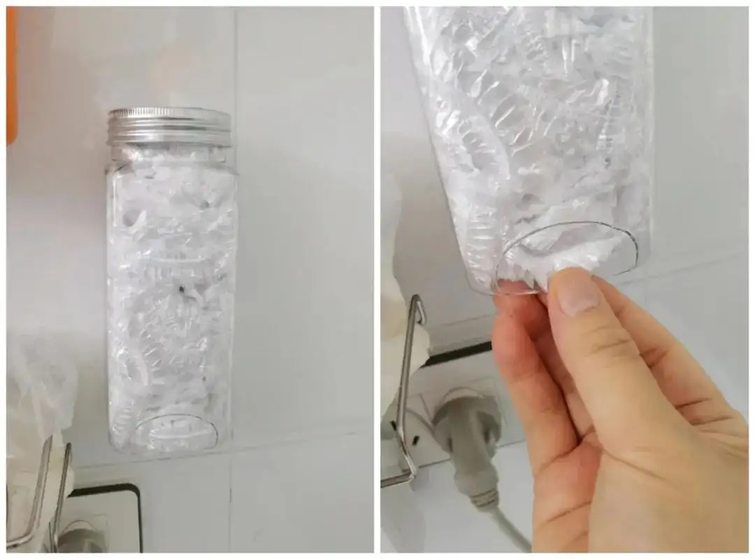 1)可以找一个瓶子,接着在底部挖一个洞,最后把它粘在墙上,既方便了保鲜膜套收纳,又方便了拿取。