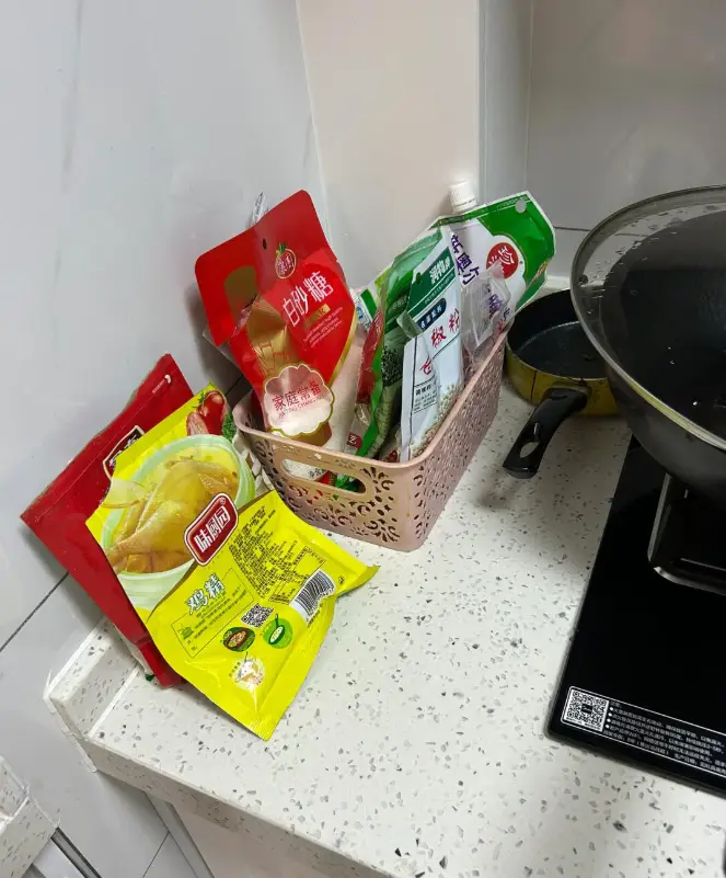 厨房调料有很多,尤其是一些袋装调料,放柜子里收纳,用起来不方便;直接放台面上,又容易东倒西歪。