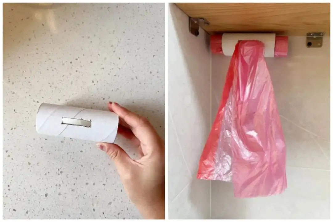 若是成品卷袋,可以找个卫生纸筒芯,然后在中间开个洞,最后将卷袋套进去并粘在吊柜下方,使用时一抽就行,同样很方便。