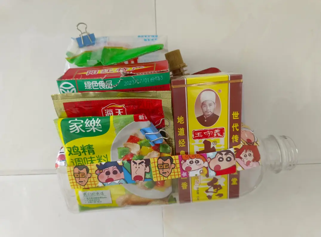 1)找一个塑料瓶,然后在瓶身处开一个条型孔,接着用两个挂钩把它挂在墙上,最后把袋装调料放进去收纳就好了。