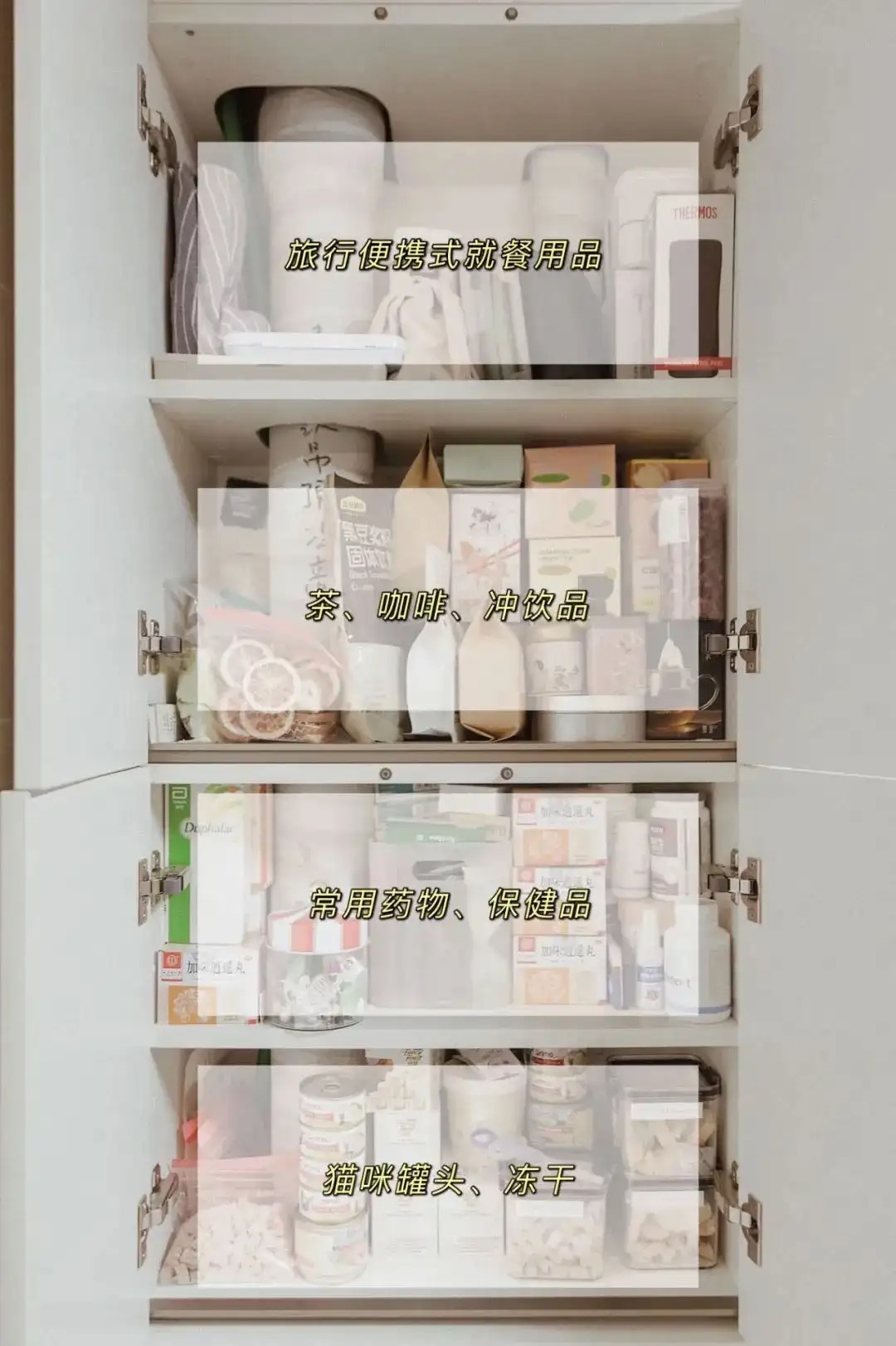 有时候觉得收纳盒是个挺占地方的存在,因为尺寸有限,并不一定能“物尽其用”使用好柜子内的每一寸空间。在厨房的一个四层柜子内,里面包着两条管道,之前各种量尺寸也没有找到特别合适的收纳盒,干脆放弃了,直接分好类把各种物品放进去,每次找起来也不会很麻烦。
