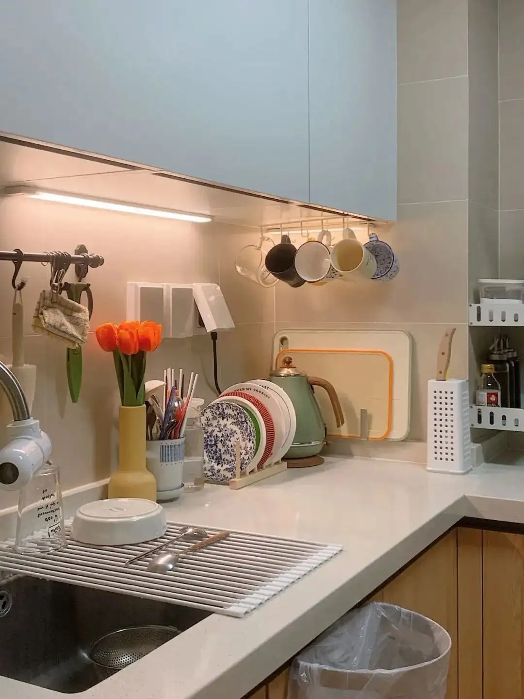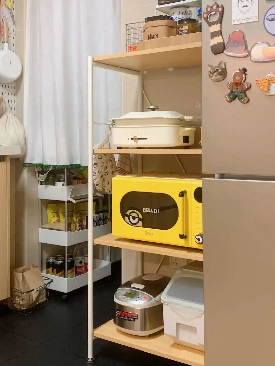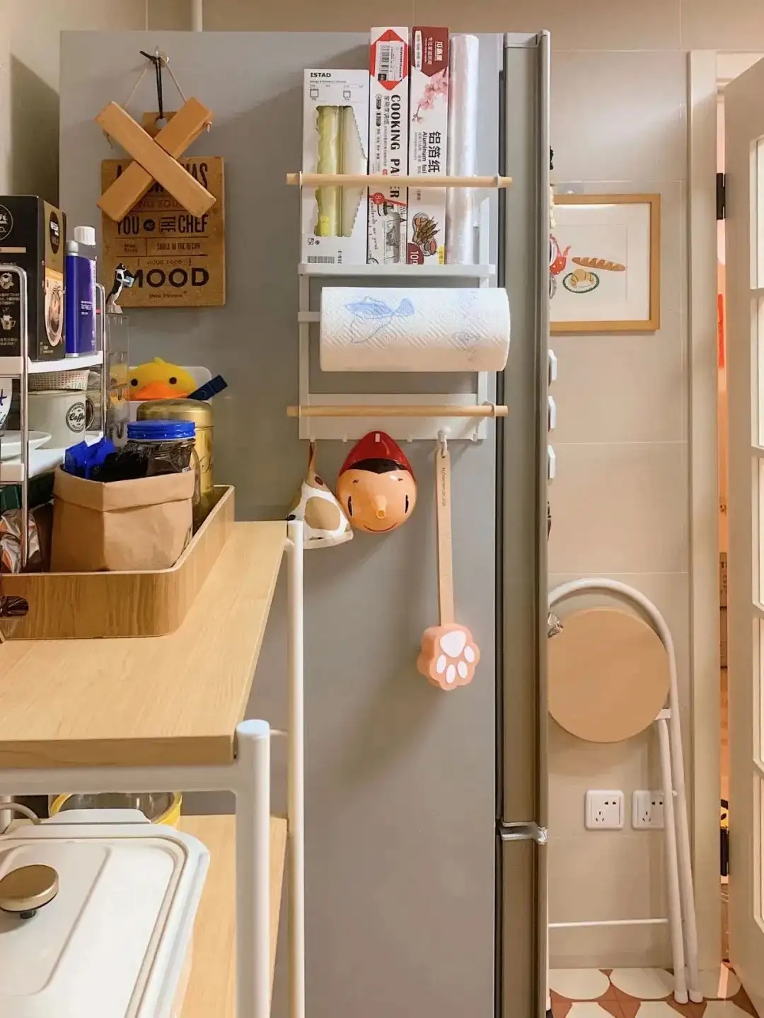 顶柜下方可以悬挂收纳架放餐具杯子,冰箱侧壁可以利用磁吸进行物品收纳,地柜的柜门上和小推车侧面可以放上挂钩,抹布、擦手巾、餐布、小剪刀、一次性手套等等常用的小物都有了好去处。