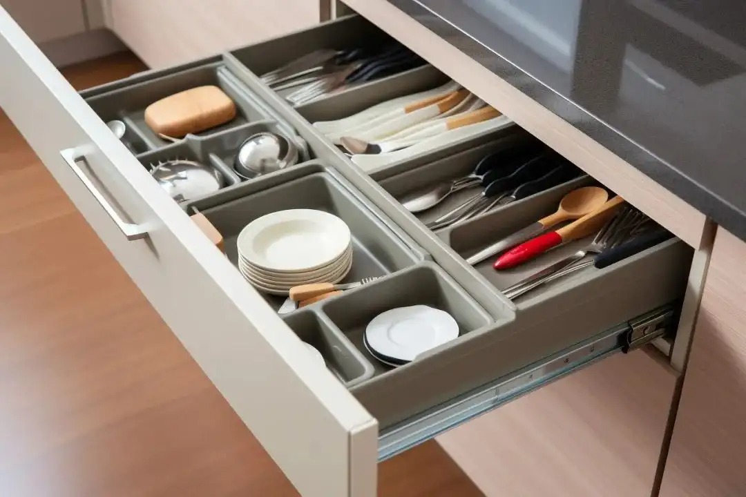 分层置物架通常是铁艺或不锈钢材质,结实、承重力强,可以有效增加台面或柜子内的收纳空间。厨房水槽下面就用了一个不锈钢+塑料的可调节伸缩分搁板,在两头顶住,用了三年从没掉下来过,超级稳。