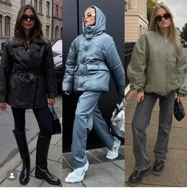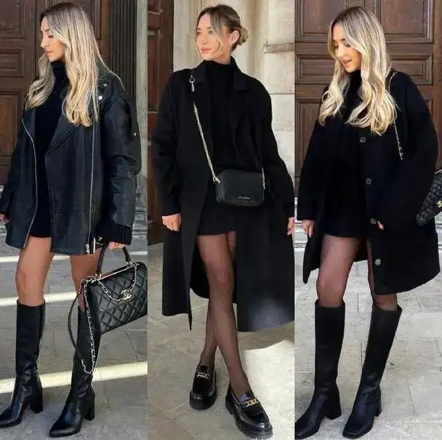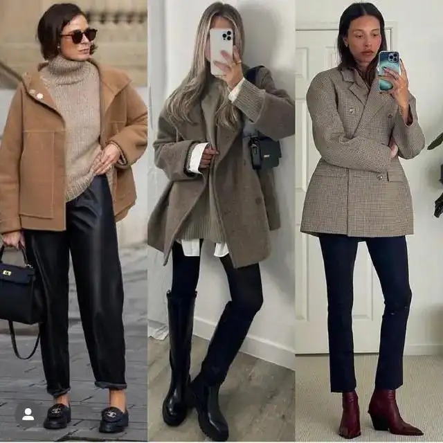 上衣可以选择皮质西装也可以选择毛呢西装,可以选羽绒服也可以选毛呢大衣,只要衣身盖过最拿不出手的大腿部位,衬托效果就是成立的。