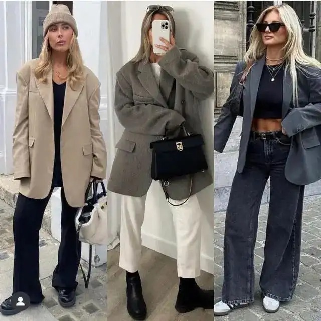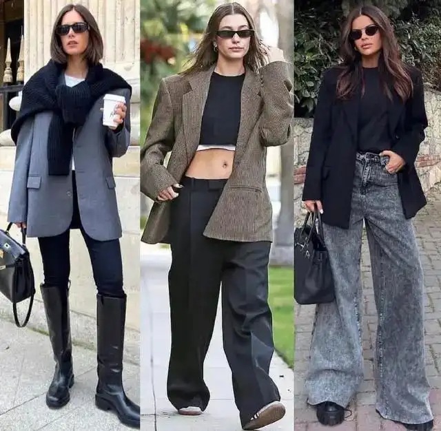 下衣可选择比大腿最大直径还要宽上3CM的直筒阔腿裤,高个子女生穿上效果最美,小个子女生穿上效果也不赖。