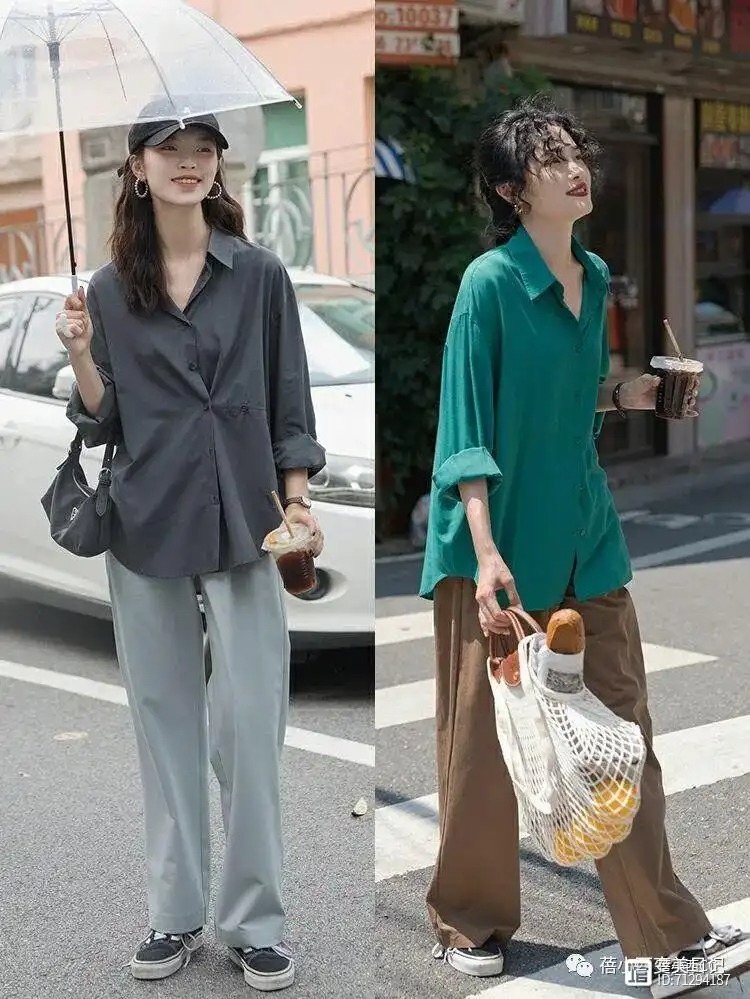 像这种宽松的衬衫以及宽松阔腿裤的搭配,在秋天超级受欢迎,因为这样的穿搭真的很舒适,很简约,宽松衬衫和阔腿裤相结合,对于身材有修饰效果,看上去很有气质,低调简约又大方。