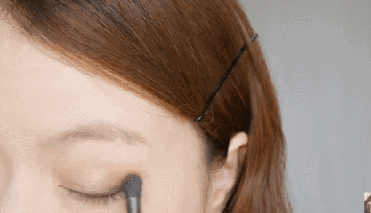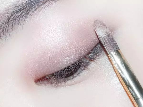 将珠光肉粉色眼影涂抹在眼皮褶皱位置之内,用眼影刷不断晕染,与之前的浅杏色眼影过渡自然