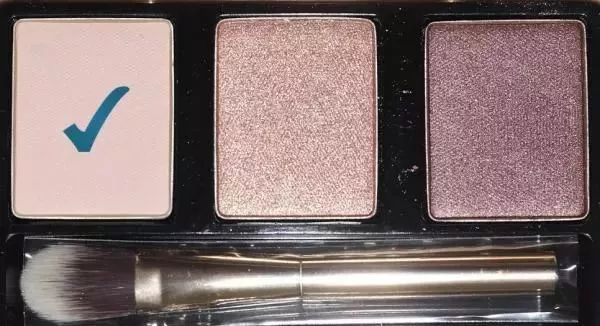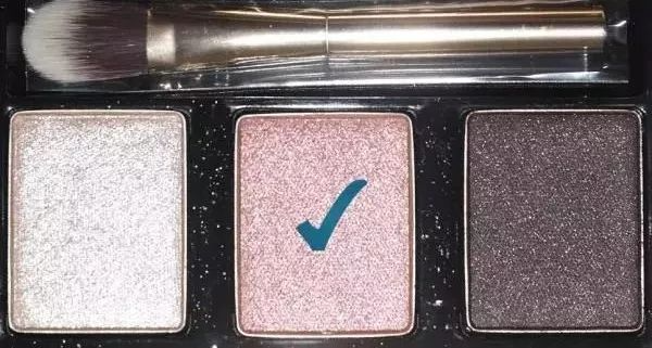 用眼影刷蘸取下图中打钩的哑光浅杏色眼影,给眼窝打底,这种哑光的眼影,能够起到让眼睛看起来不难么浮肿的作用