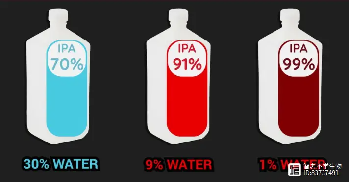 推荐使用浓度较低的异丙醇来消除细菌。这是因为由于浓度较高,会引起外部伤害,从而形成针对这些生物的保护屏障。水对于杀死病原微生物的生长至关重要。它在使细胞膜的蛋白质变性中起着至关重要的作用。如果添加额外的水,蒸发会减慢,从而增加表面接触时间,从而提高效果。