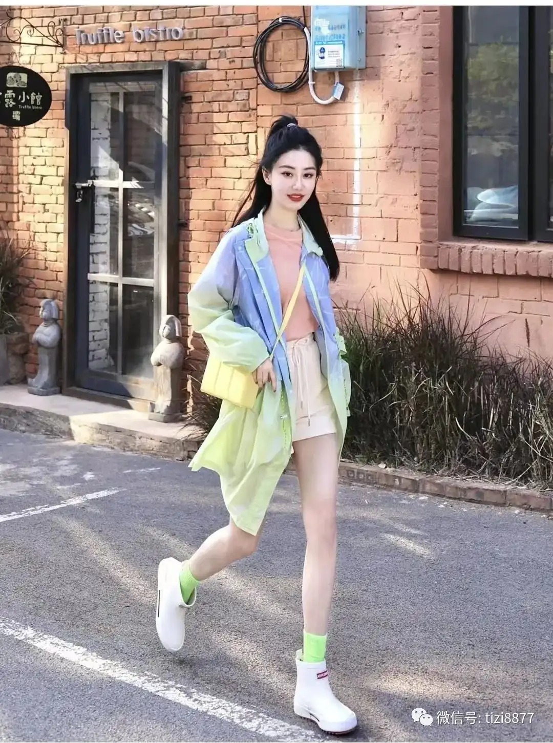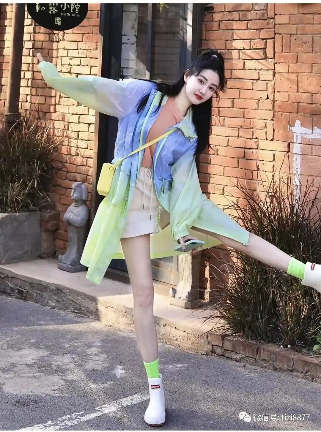马卡龙少女的夏天穿搭,像糖果又像青柠海盐Mojito,清凉又活力满分。这件外套居然是防晒衣,与众不同的蓝绿渐变撞色,是属于夏日青空的颜色,夏天出门绝对是最高颜值防晒衣。内搭了绿色的T恤和米色短款+白色小短靴,一套出街超时尚。