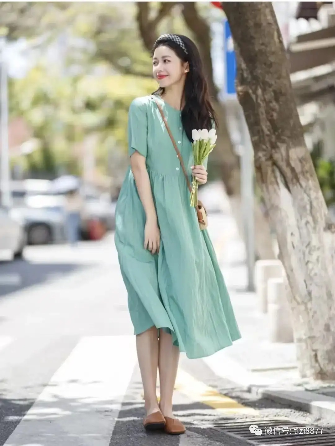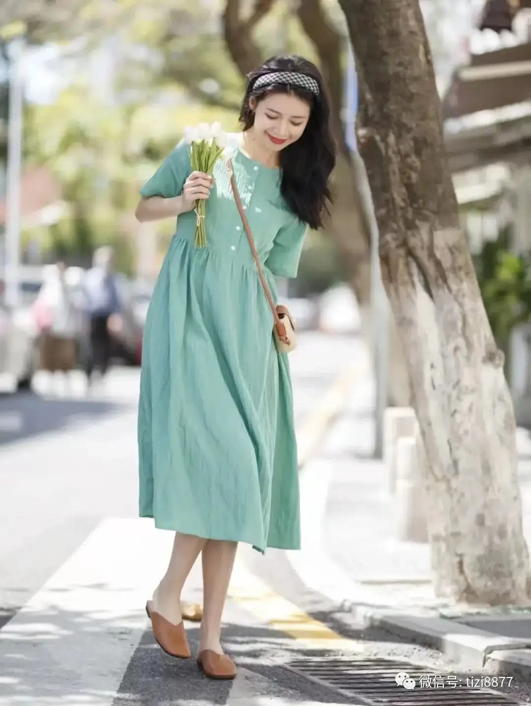 绿色森系慵懒风连衣裙配色真心是夏天本夏,夏季出行最佳伴侣。配饰的色系选择了咖色,随性的凉拖加上森系的斜挎小包,再加上裙子同色发箍,整体视觉更加饱满有层次了。