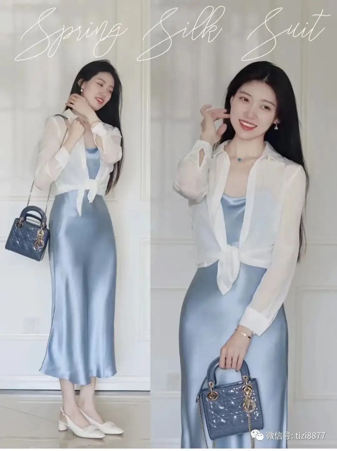 look6 桑蚕丝衬衫+蓝色绸缎连衣裙+白色单鞋