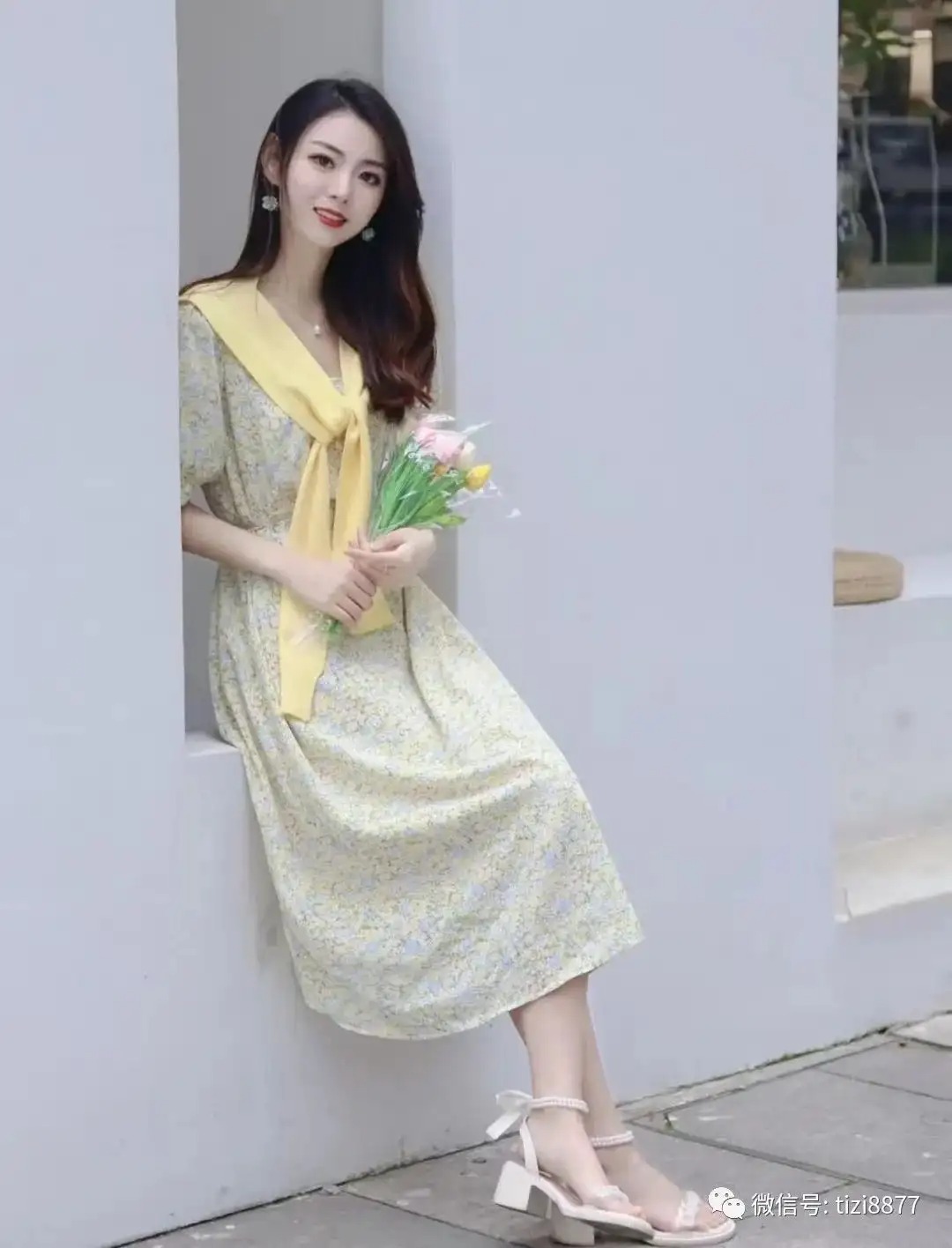 这件简直就是温柔届的扛把子,黄色的碎花真的很嫩很减龄,尤其是加上黄色的披肩真的太爱这个小设计了,泡泡袖和飘逸的裙摆也很自带公主气息,甜美又温柔的气质,搭配白色针织串粗跟凉鞋,一套法式淑女感拉满。