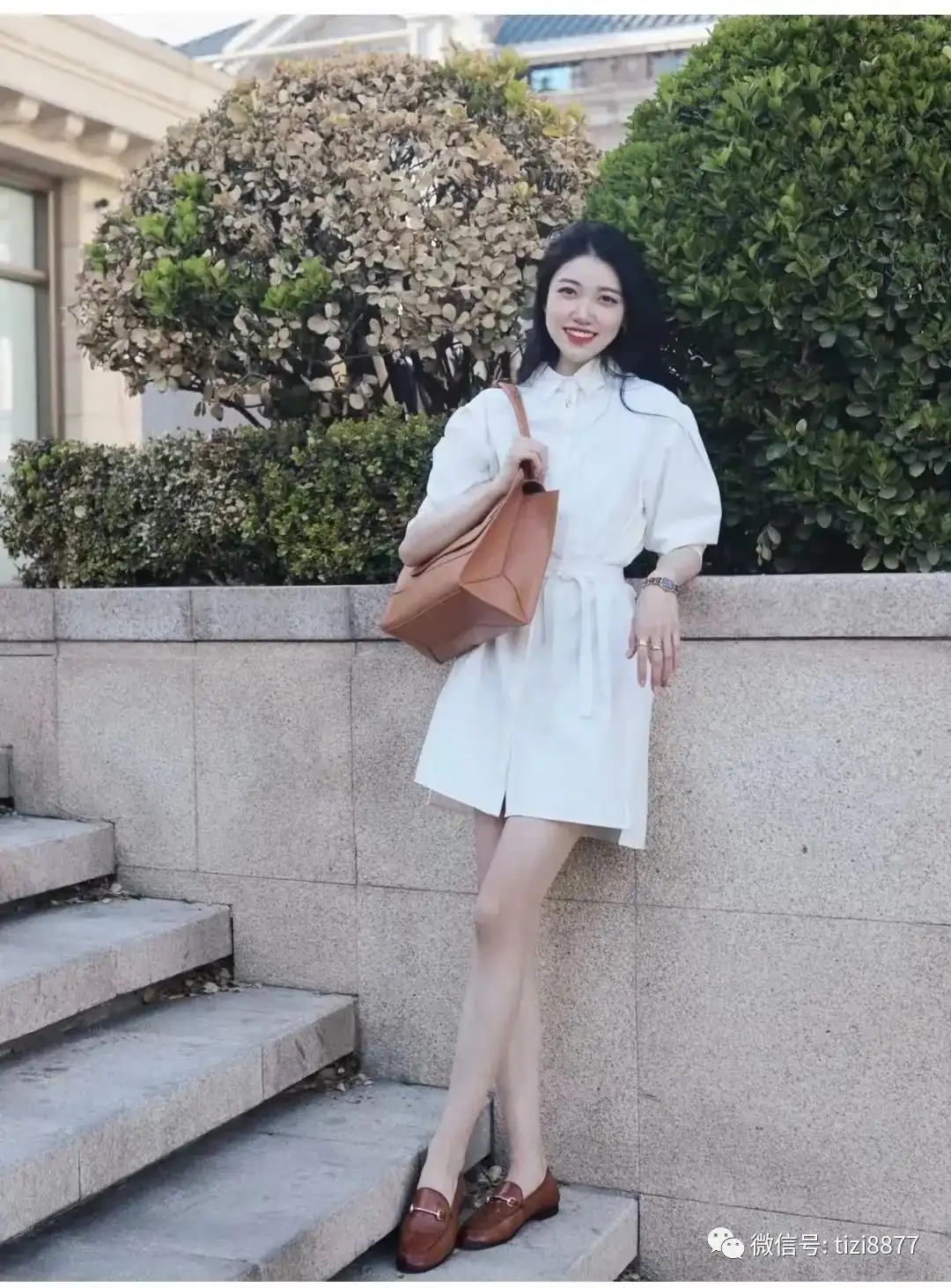 每次穿白衬衫裙回头率都会增加,大概是因为它可以衬托出人特有的清爽明艳气质吧。因为是极简的款式更考验面料和剪裁,喜欢这条略有泡泡袖的小心机,增添了一点活泼的气质,材质也不容易起褶,保持元气一整天。包包和鞋子都搭配的复古大气的焦糖色,鞋子这种做旧的光泽很有英伦感。
