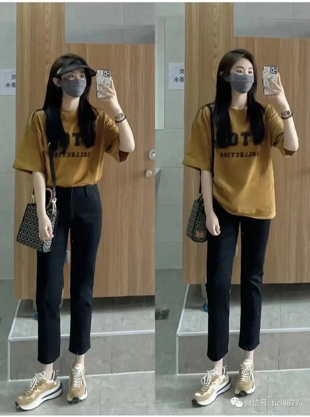好喜欢简简单单的穿搭,这件姜黄色的字母T恤就真的很显白!而且T恤上面的黑色字母和下装也很搭,下半身是小直筒的九分裤,到脚踝长度真的香,显瘦显高。