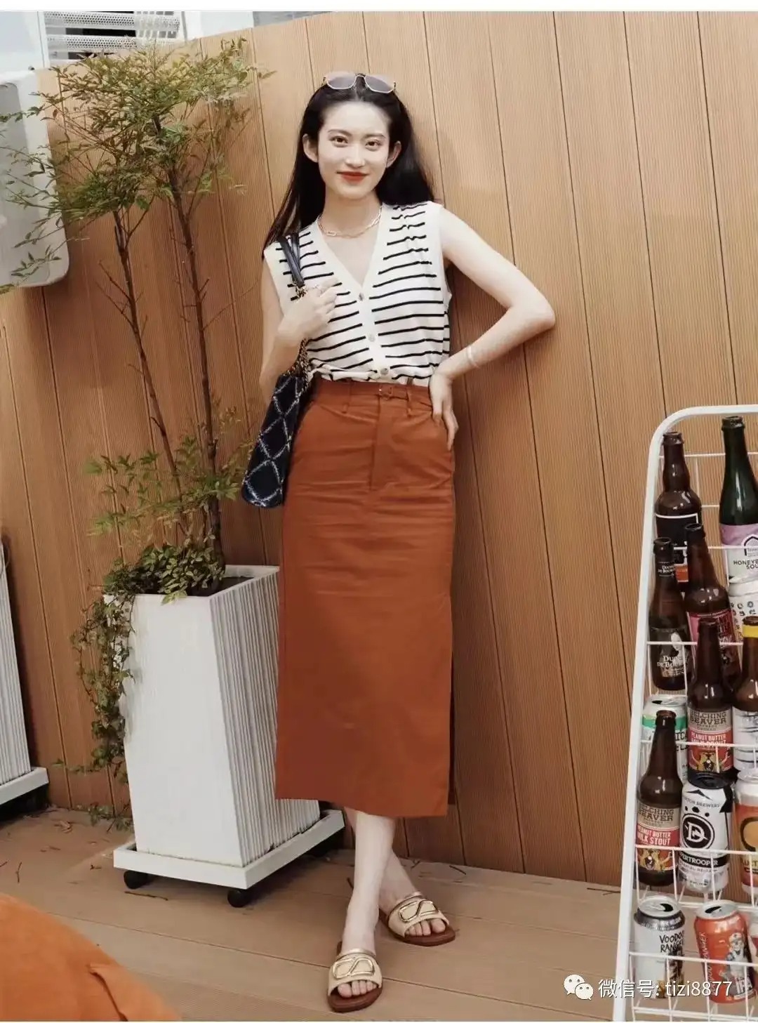look2 条纹无袖背心+橙色半身裙+凉拖
