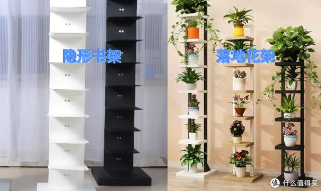 贵当然有贵的道理,一般贵的隐形支架都采用碳钢制作,抗压强度和韧度都是相当给力的,而落地花架一般采用环保颗粒板和各类人造板组合,强度上逊色一筹,收纳空间来说隐形支架相对更容易摆放,隐形书架的承力板较薄隐形效果更好一些,但摆放的效果从正面看还是比较相近的,对于我这类三分钟热度的人来说,无非就是想要一个类似且能收纳的物品,落地花架会更让我不心疼。