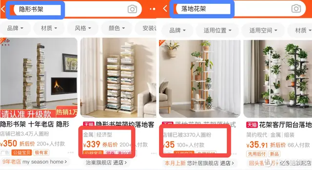 价格的对比自然少不了,从搜索图可以看出隐形书架的昂贵,但我还想说的是这也只是基础款的价格,层数越高价格也越离谱,12层甚至高达1590元,这真的是离谱妈妈给离谱开门,离谱到家了,当然花架随着高度的增加价格也会递增,但却也远远比不上这镶金的书架!!!