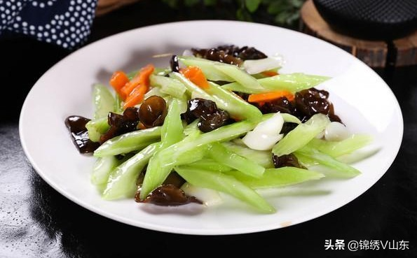6、转大火,放入芹菜块翻炒至断生,放入木耳翻炒,随后放入调料,炒匀入味就可以出锅啦!