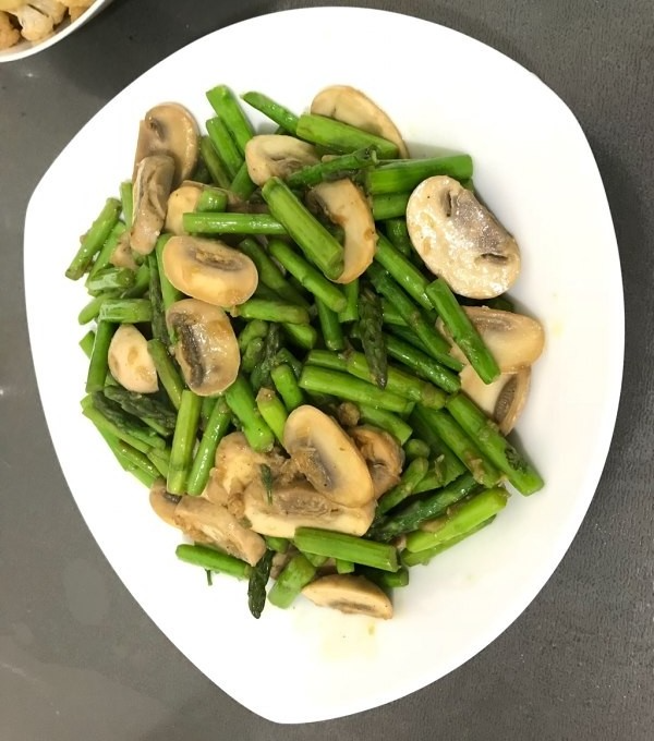 4、平底锅加热加点油炒香姜,蒜和口蘑,加1勺蚝油,加肉丝炒散,加洋葱和甜椒,加盐和五香粉,最后加焯好的芦笋快速颠炒出锅。