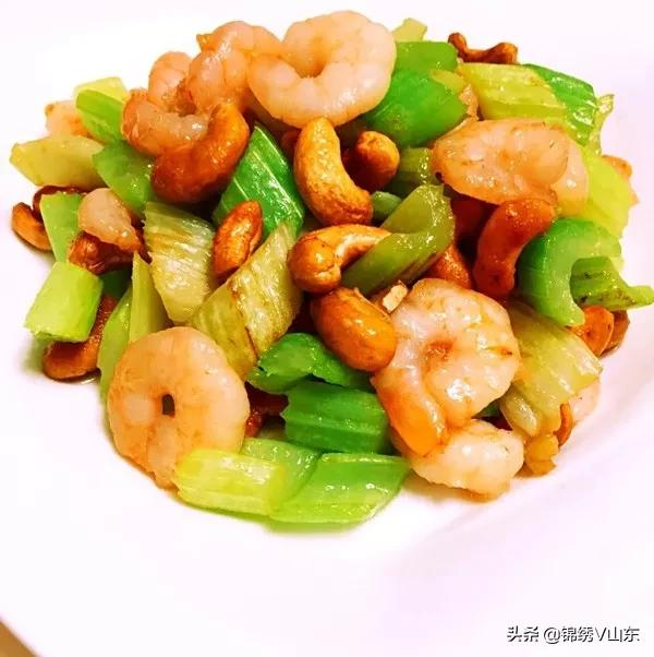 第四步:西芹炒至变色后,再加入虾仁和腰果快速翻炒均匀;整个过程需要大火快炒;