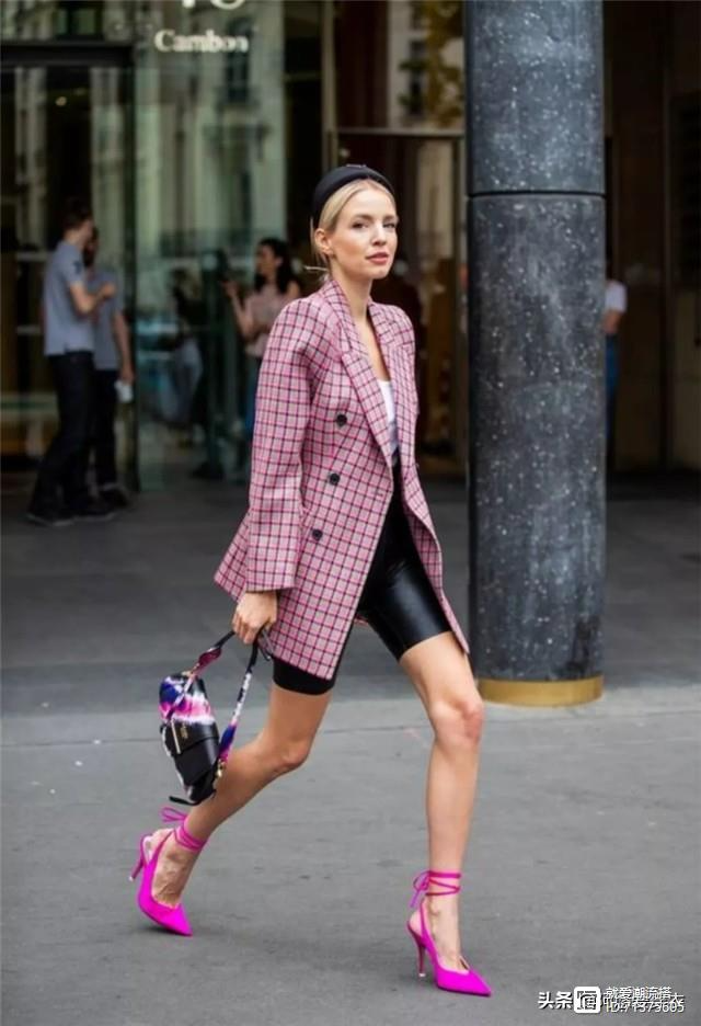 想要看起来更正式,可以穿条短款西装裤,想要更有时尚感,可以穿条骑车裤。还可以给西装外套搭配条高腰带,这样很容易提高腰线,还显瘦。