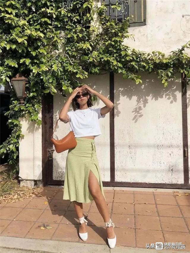 对于裙摆太大、太长的裙子就不要做过多考虑了,只会压低个子。选择短款的上衣与高腰裙进行搭配,能最大限度地凸显出高腰线,小个子女生也能穿出大长腿。