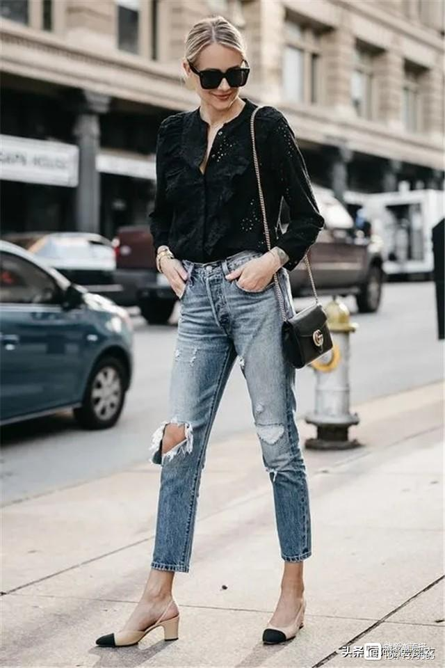 其实鞋子的鞋跟不用特别高,3-5厘米的高度足够,加上尖头的鞋型,效果会更好。选择穿双和裤子、裙子颜色一致的鞋子,在视觉上有拉长腿长的效果,这个技巧大家可以用一下。