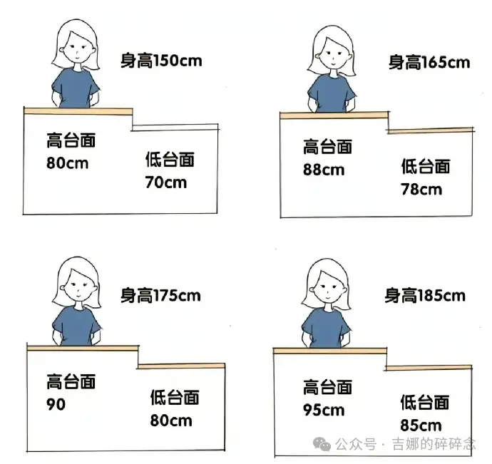灶台高(如果做了高低台的话,比操作台低50cm)