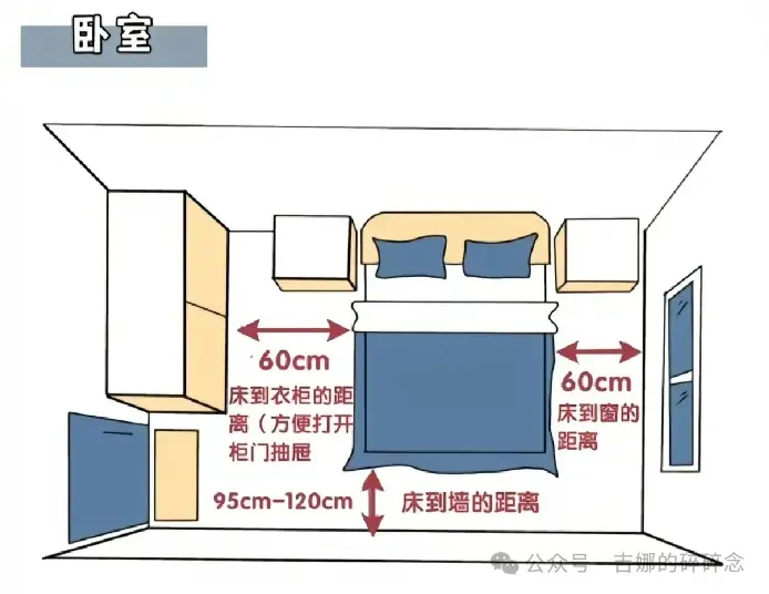 床到衣柜的距离:60-80cm最合适,方便打开衣柜门或者拉开抽屉,推拉门衣柜可适当缩小距离。