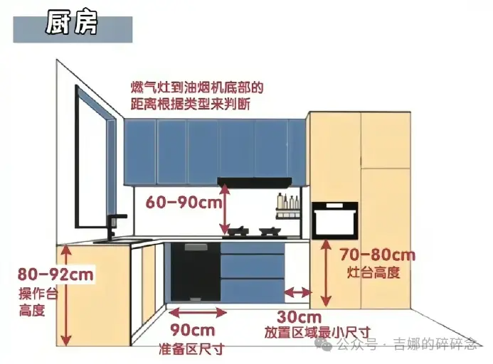 厨房是家务劳动的核心区域,合理尺寸能大大减轻劳动强度。