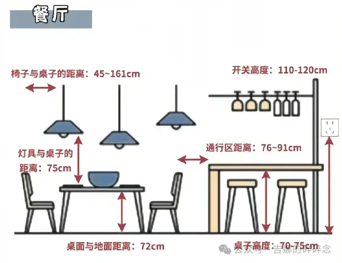 台面:高度一般为72cm,适合就餐,不用时还可将椅子塞进桌底节省空间通行区要留出76-91cm的一个过道