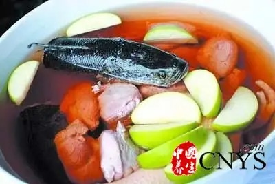 制法:生鱼去鳞、去鳃,用清水冲净鱼身、抹干。用姜落油锅煎至鱼身成微黄色;苹果、生姜、红枣洗干净后,苹果去皮去蒂,切成块状;生姜去皮切片,红枣去核。瓦煲内加入适量清水,用猛火煲滚。然后加入全部材料,改用中火继续煲两个小时左右。加入盐调味,即可饮用。每日两次,早晚饮用。