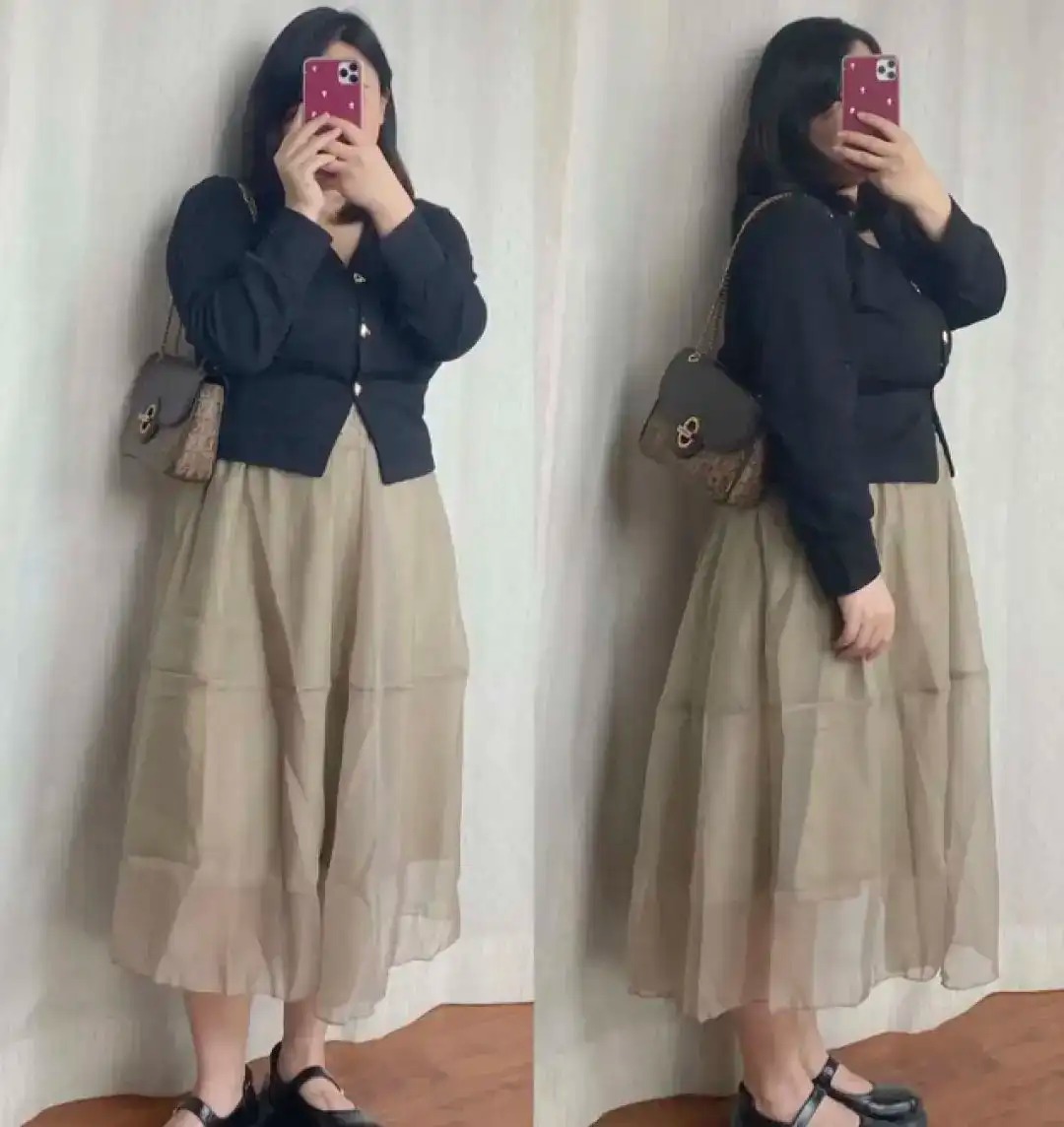 随着中年发福,我们腰部最细的地方也在往上提,大概就是胸部以下的部分。因此这里还有一个穿衣小技巧,那就是我们穿这种半身裙的时候,最好把裙子往上提一些,这样视觉看起来更美观。