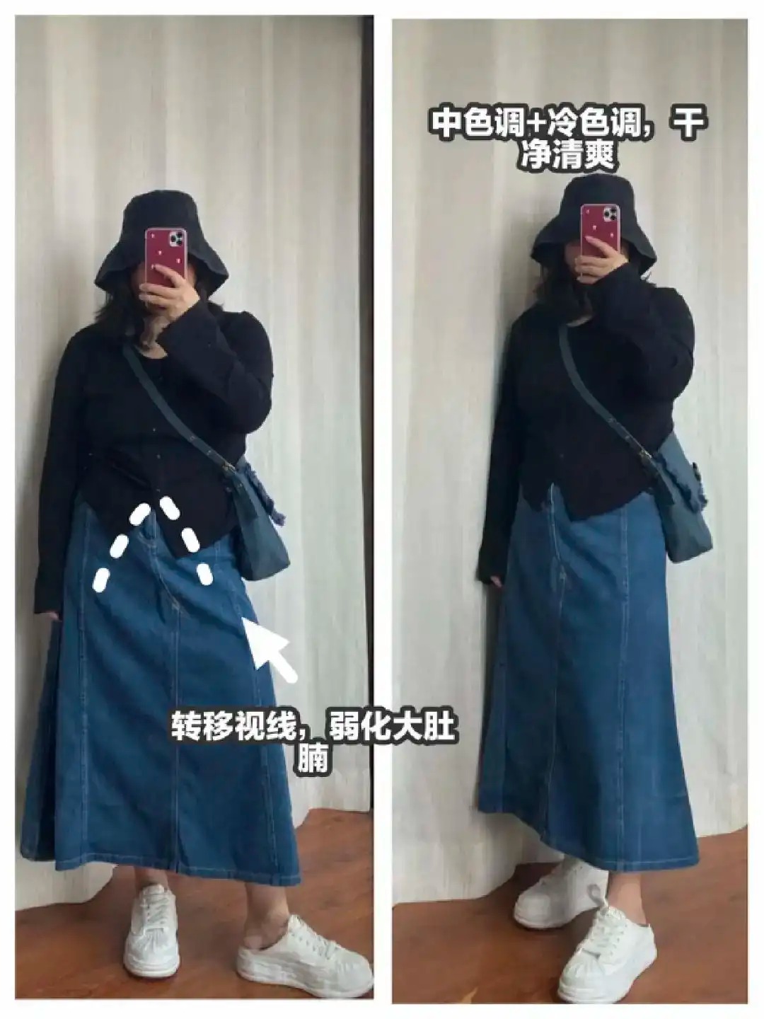 这个技巧前文我们也提到过,就是注意线条上的细节,从视觉拉长我们的身材比例,优化我们的身型。如果说前面提到你们还没有很直观的感受的话,那么下面这张对比图就可以让你看出注意线条细节,对于显瘦和时尚而言是多么的重要。