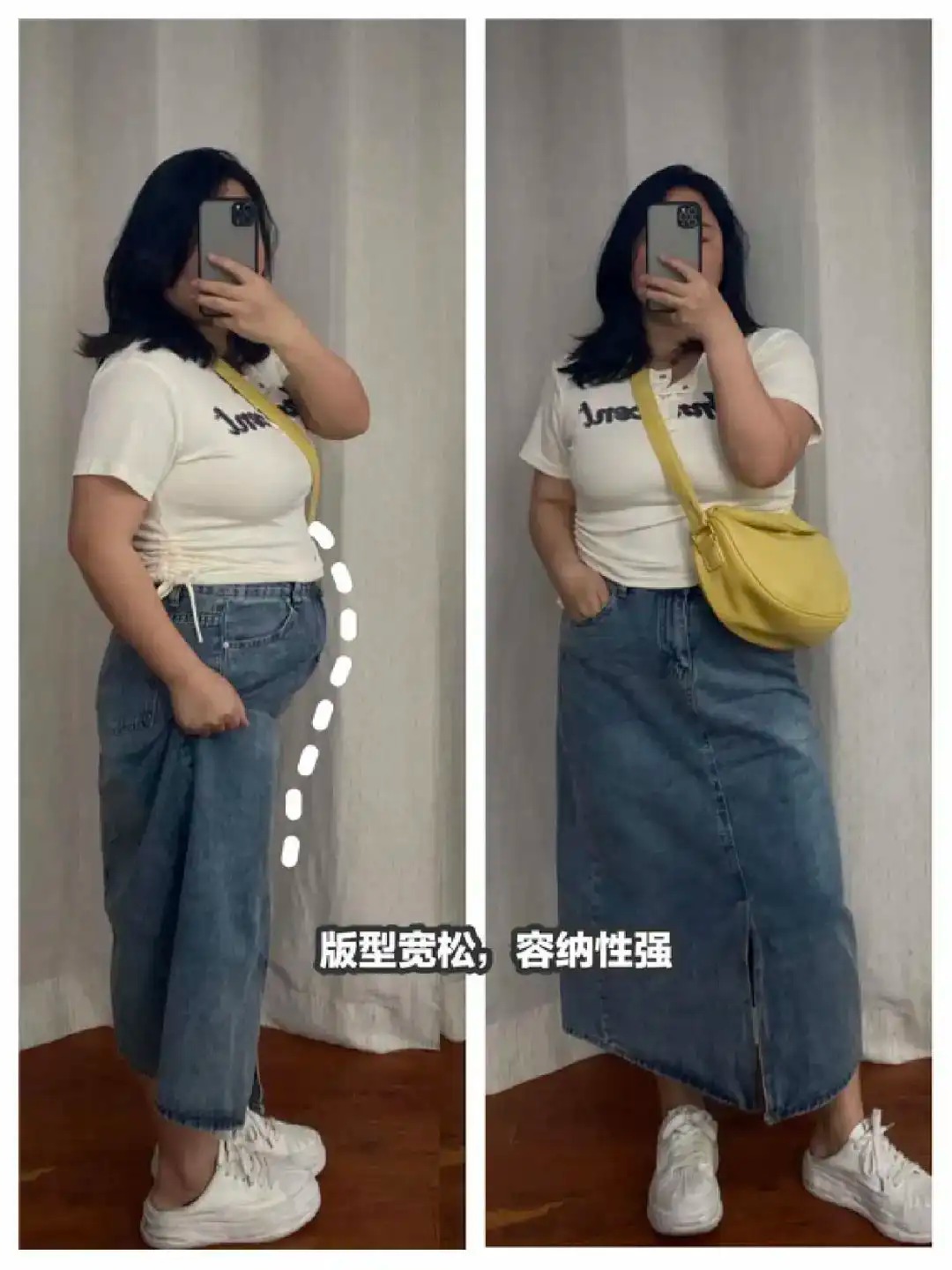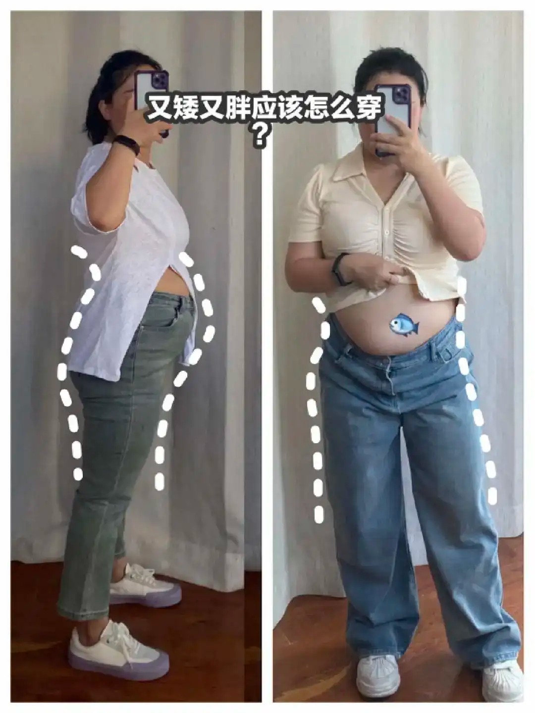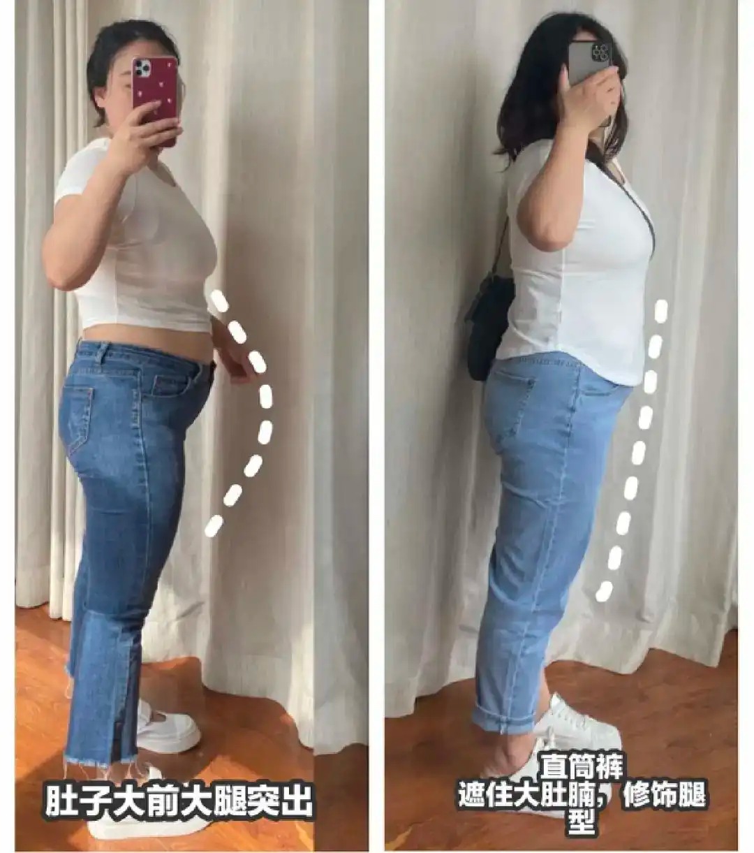 中年女性最好不要穿紧身牛仔裤,尤其是中年矮胖女性。看下面这张对比图就知道了,紧身牛仔裤会暴露我们的腿型缺陷,并且穿着起来也十分的不舒适,对我们女性的健康也不友好。