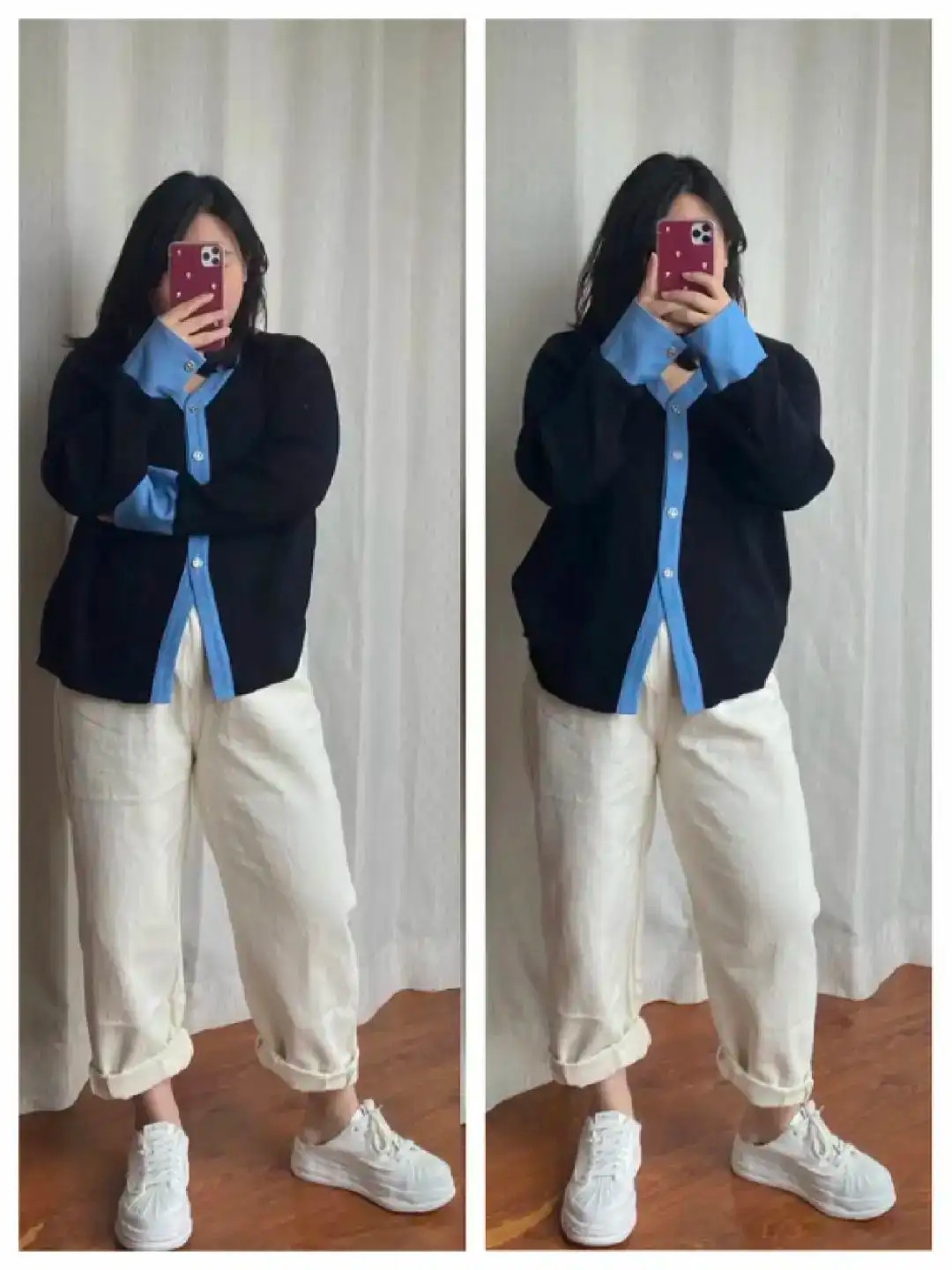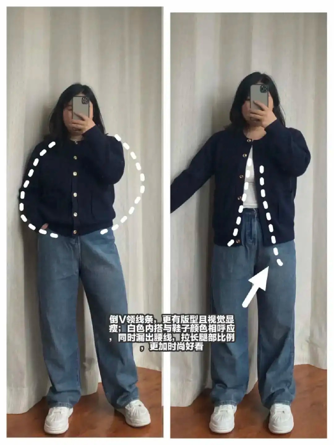 左边全扣型针织衫,看起来不仅臃肿且呆板沉闷,老气十足。而右边没有扣的针织衫立马青春活泼了许多,且倒V领型敞开线条,视觉上看起来更加的有版型。露出的些许白色内搭,还与我们脚上的白鞋进行了巧妙色彩呼应。