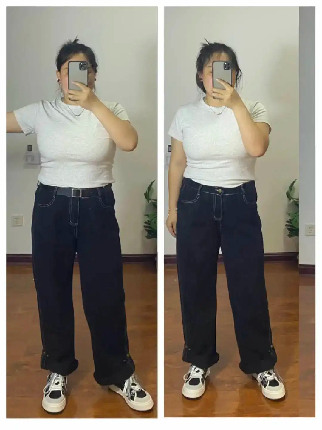 直筒裤一定要选择高腰的,矮个子女生强调腰线十分重要。我们可以利用一根皮带来视觉强化我们的腰线,拉长我们的腿部比例。如果说直筒裤于长,我们要把它挽起来,避免过于冗长显累赘。