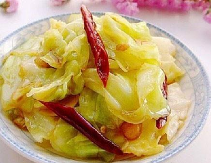 【酸辣卷心菜】做法:1.包菜用手撕成碎片,洗净沥干水;2.将花生油、盐、醋、生抽、水淀粉、白糖、调成一碗酱汁;3.油至十成热,把包菜放进去快速翻炒,炒至回软,马上倒入朝天椒和蒜,再炒1分钟即可~
