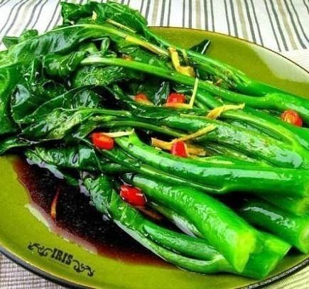 【白灼芥蓝】做法:1.芥蓝洗净,烧开水,开水中放入少许盐,将芥蓝放入开水中烫至8成熟,装盘;2.姜切丝,朝天椒切片,放入生抽、糖,浇在装盘后的芥蓝上;3.另起锅,烧热油少许,浇在芥蓝上即可~