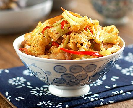 【干煸花菜】做法:1.五花肉切小块,红椒切丝,葱切段,蒜头去皮拍散;2.油锅入蒜头爆香。继续加入五花肉煸至金黄;3.倒入洗净沥干的花菜煸炒;4.调入少许料酒,一点生抽继续煸至花菜断生;5.加半勺香辣豆豉酱,盐和糖煸炒至入味,出锅前加入红椒丝和葱炒匀即可~