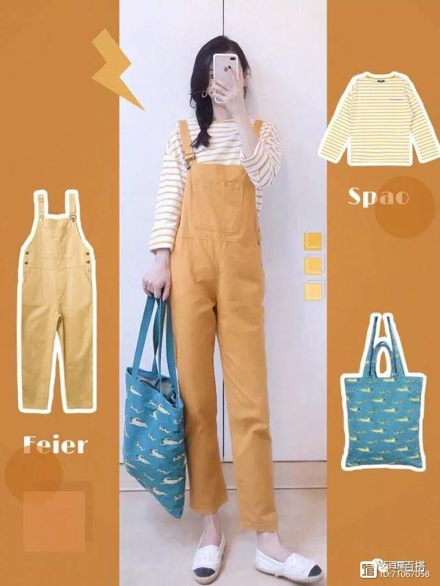 下面我们先来看一下第一套搭配,这一套搭配选择的是黄色系的穿搭。黄色系的搭配更加的元气满满,比较的适合皮肤比较白皙,并且非常喜欢减龄风的女孩子。穿着上身会非常的可爱,尤其是这种背带裤的设计,真的是16岁的少女无疑了。