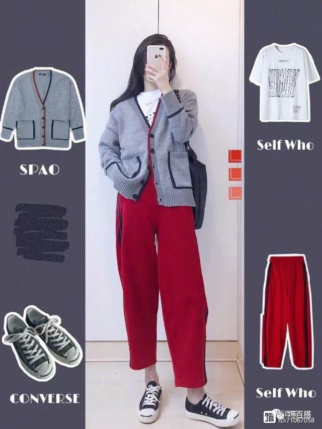 看似是随意的搭配,但其实处处都暗藏玄机。说的这套搭配,灰色的针织衫与红色的条纹萝卜裤恰到好处,尤其是帆布鞋的搭配更是点睛之笔,让整搭都具有独特的街头风气质。