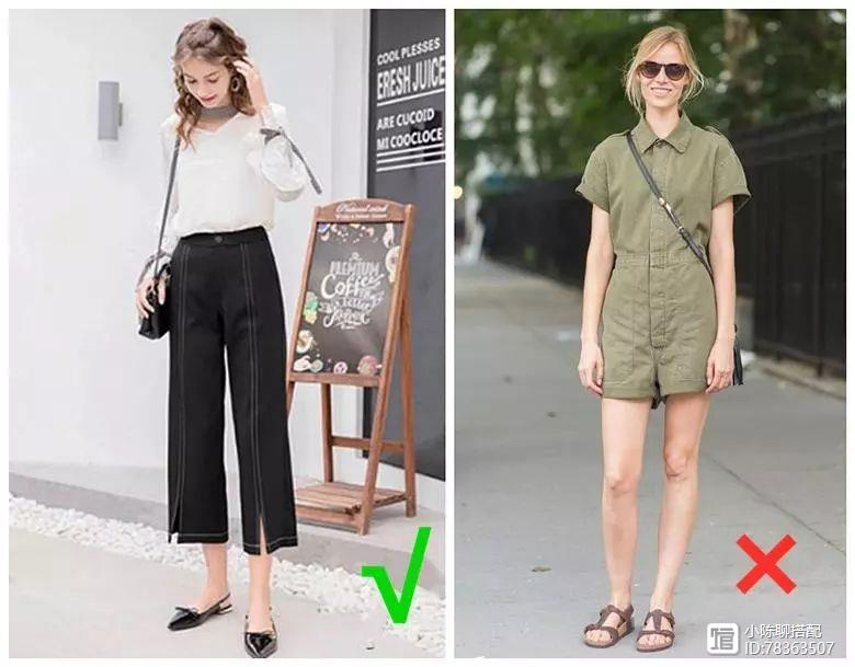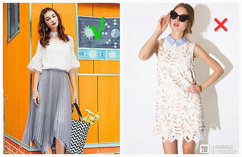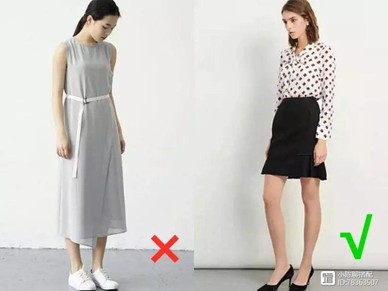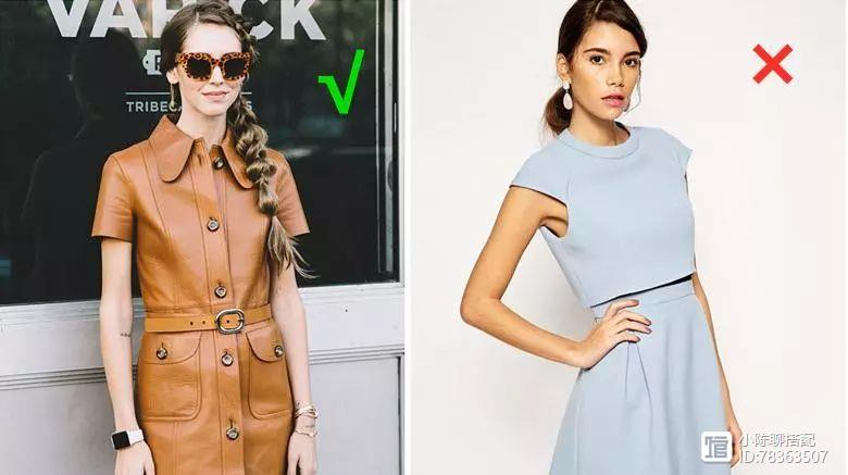 腰线一定要找准定位,适当提高腰线位置能够凹出完美的身材。不要学右图的女生选择无腰款式或者腰线不突出的衣服,很容易就穿成了难看的五五分身材,还是选择左图的女生,尽可能想办法提高腰线就是了。
