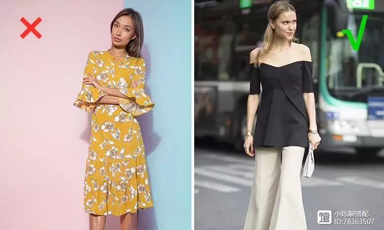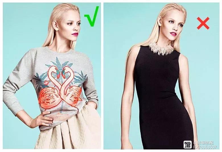 直筒姑娘的肩颈不够长,穿起来衣服总显得太过单薄,所以需要拉长肩颈线条。就不要像左图女士选择小领口的衣物了,显得肩膀更加瘦弱不堪,何不如右图可以选择大领衣物,横向扩展肩部,更有气质。